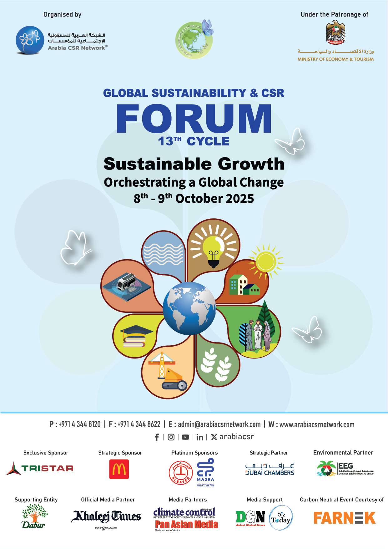 The forum is a platform that takes place annually alongside the Arabia CSR Awards. It is the region’s premier convention on CSR and sustainability. It attracts leaders, thinkers, evangelists, practitioners and policy makers from all over the globe. The forum targets latest themes, topics and debates around CSR and sustainability, illuminating minds and motivating adoption of international standards and best practices.